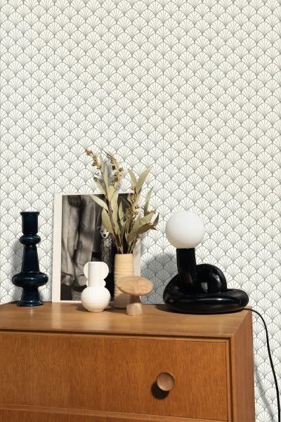 Tapeta ve stylu Art deco v bílé barvě se zlatým motivem.