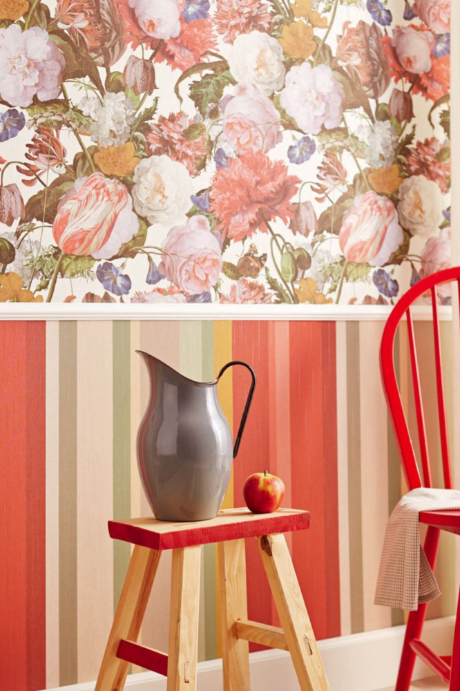 Nádherná pruhovaná tapeta v pastelových barvách je inspirovaná starými mistry malíři. I povrch tapety vypadá jako malířské plátno.