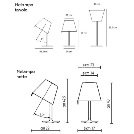 Pokud svítidlo směřuje směrem dolů : v 58 cm x š 42,2 cm a Ø podstavce 24cm, pokud svítidlo směřuje vzhůru, je výška celého svítidla 83,6 cm.