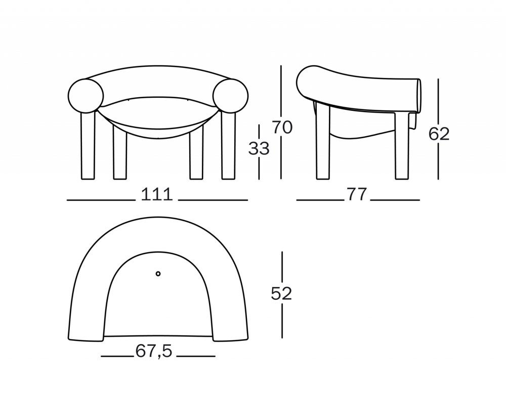 Rozměry: v. 70 cm, v. sedu 33 cm, v. područek 62 cm, h. 77 cm, š. 111 cm