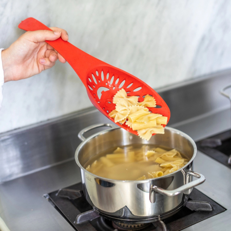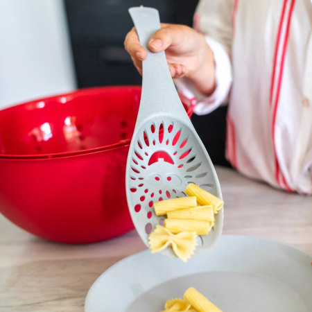 Pro tento kus kuchyňského náčiní se stal inspirací německý kvězdný kuchař Mirco Reeh. Jedná se o promyšlenou kombinaci lžíce a sítka, díky čemuž z hrnců vylovíte cokoliv (knedlíky, maso nebo gnocchi. Navíc je opatřena i háčkem s přísavkou v podobě jazyka.