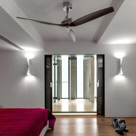 Nástěnné svítidlo, které uvolňuje měkké nepřímé světlo směrem vzhůru spolu s rozptýleným světlem podél vertikálního otvoru. Lze doplnit stojací lampou.
