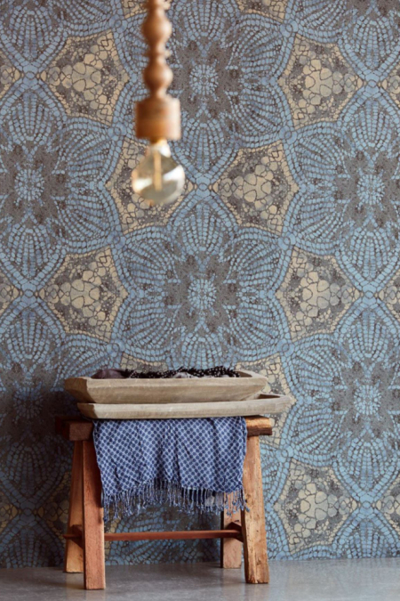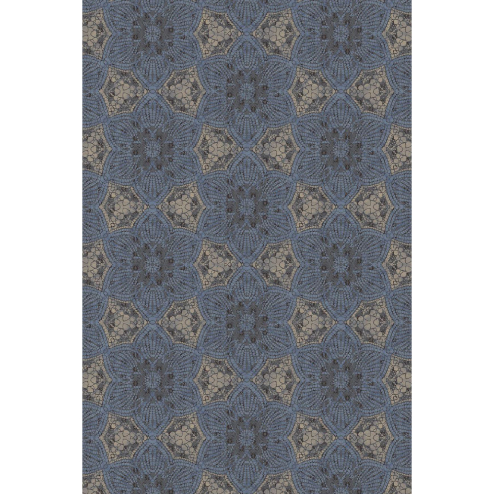 Úchvatná tapeta z kolekce inspirované krásou Afriky. Hlavním květinový motiv je v modré barvě, která je doplněna stříbrem, černou a šedou barvou.