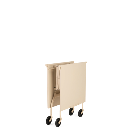 Pojízdný skládací stolek kombinuje plast s kovovými prvky. Lze jej využít v kuchyni jako odkládací stolek, jako barový stolek nebo také jako konferenční stůl.