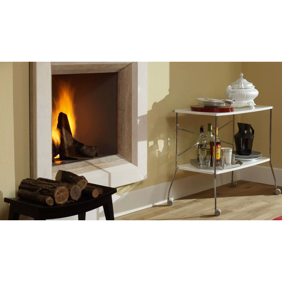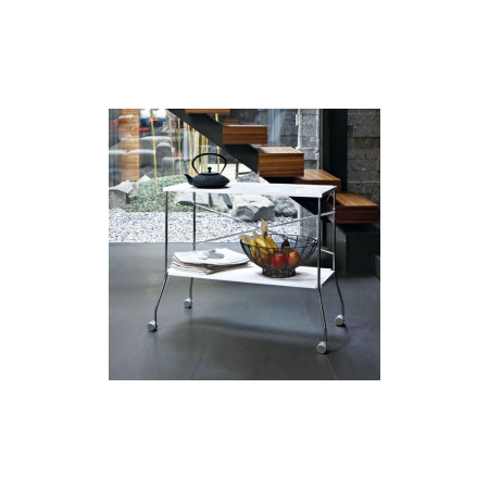 Pojízdný servírovací stolek na kolečkách spojuje kovový rám s platovým povrchem. Podnosy jsou z polymethylmetakrylátu a mohou se využívat samostatně. Hodí se jako vozík, ale i jako vedlejší stůl. Když jej zrovna nepotřebujete, zabere jen minimum místa - je skládací.