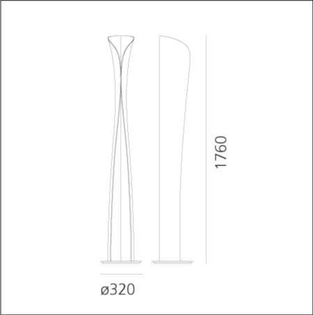 Stojací lampa, jejíž tělo se skládá z ocelového plechu, který byl jemně plátován, aby obklopil a usměrnil světlo, nepřímé směrem nahoru a rozptýlené podél svislého otvoru lampy.