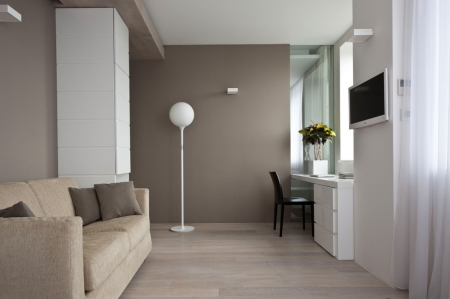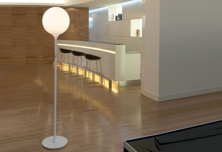 Castore kombinuje jednoduchý geometrický tvar kulatého difuzoru z foukaného skla se světelným rámem, který k němu měkce přiléhá na jedné straně a na druhé straně je zakončen kovovou smyčkou, která funguje jako stmívač a je spojena s tyčí