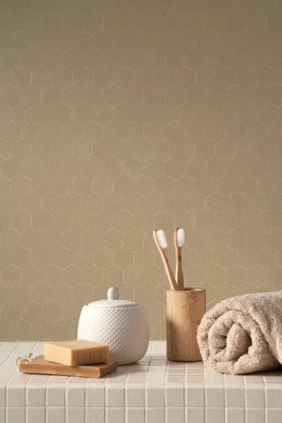 Jako včelí plástev - dokonalé šestiúhelníkové struktury - vzor Meli vesele bzučí na stěnách. Designu zdůrazňuje čistotu.