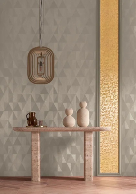 Design Parangon nese jméno drahokamu s dokonalými liniemi. Inspirován uměním broušení drahokamů, jeho geometrický design složený z kovových nití vypadá, jako by byl vyryt do materiálu. Je zdoben kovovým přetiskem, jehož barvy ladí se základním odstínem.