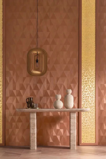 Design Parangon nese jméno drahokamu s dokonalými liniemi. Inspirován uměním broušení drahokamů, jeho geometrický design složený z kovových nití vypadá, jako by byl vyryt do materiálu. Je zdoben kovovým přetiskem, jehož barvy ladí se základním odstínem.