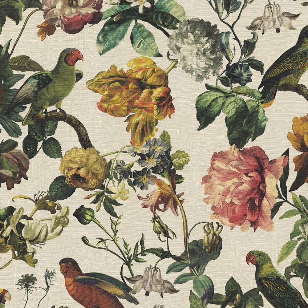 Elegantní tapeta plná květin a papoušků.