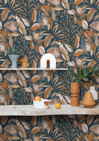 Nádherná tapeta Jardin de Bel Air s motivy v oranžové, růžové a okrové barvě s dotyky zlata.