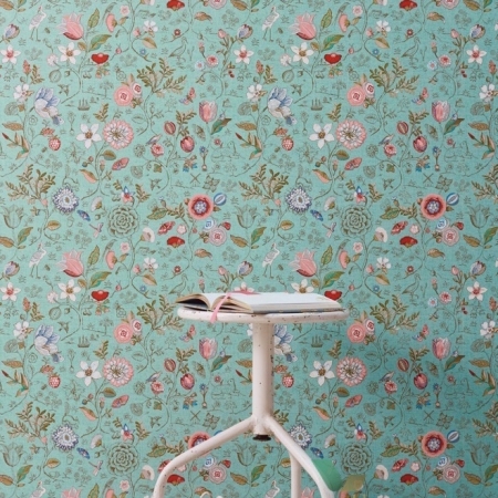 Další řada oblíbených tapet z kolekce Pip. Tato tapeta je plná rostlin a zvířat v tmavě modré barvě a na modrém podkladu. Některé části rostlin nebo některá zvířata jsou vybarvena, což vytváří velmi zajímavý efekt.
