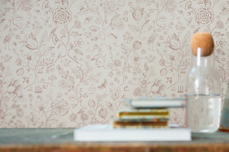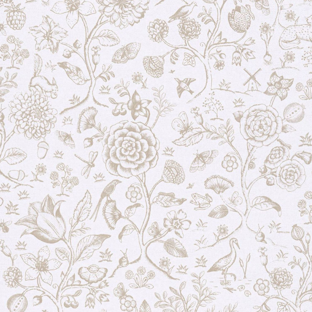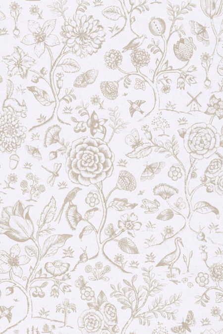 Další řada oblíbených tapet z kolekce Pip. Tato tapeta je plná rostlin a zvířat v tmavé šedobéžové barvě a na šedobéžovém podkladu. Vzor dokonce lehce vystupuje z tapety.