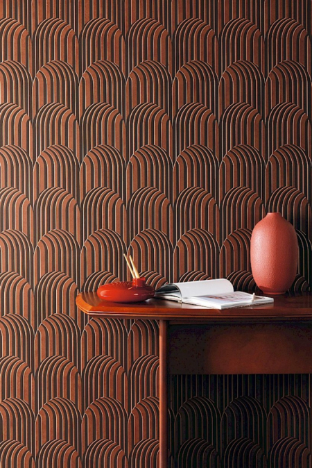 Tento krásný design travertinového stolu je převedený z 3D objektu do 2D výkresu. Optický klam je umocněn jemným stínováním v kontrastním lesku. Světlo osvětluje oblouky a dodává tapetě výrazně architektonický dojem.