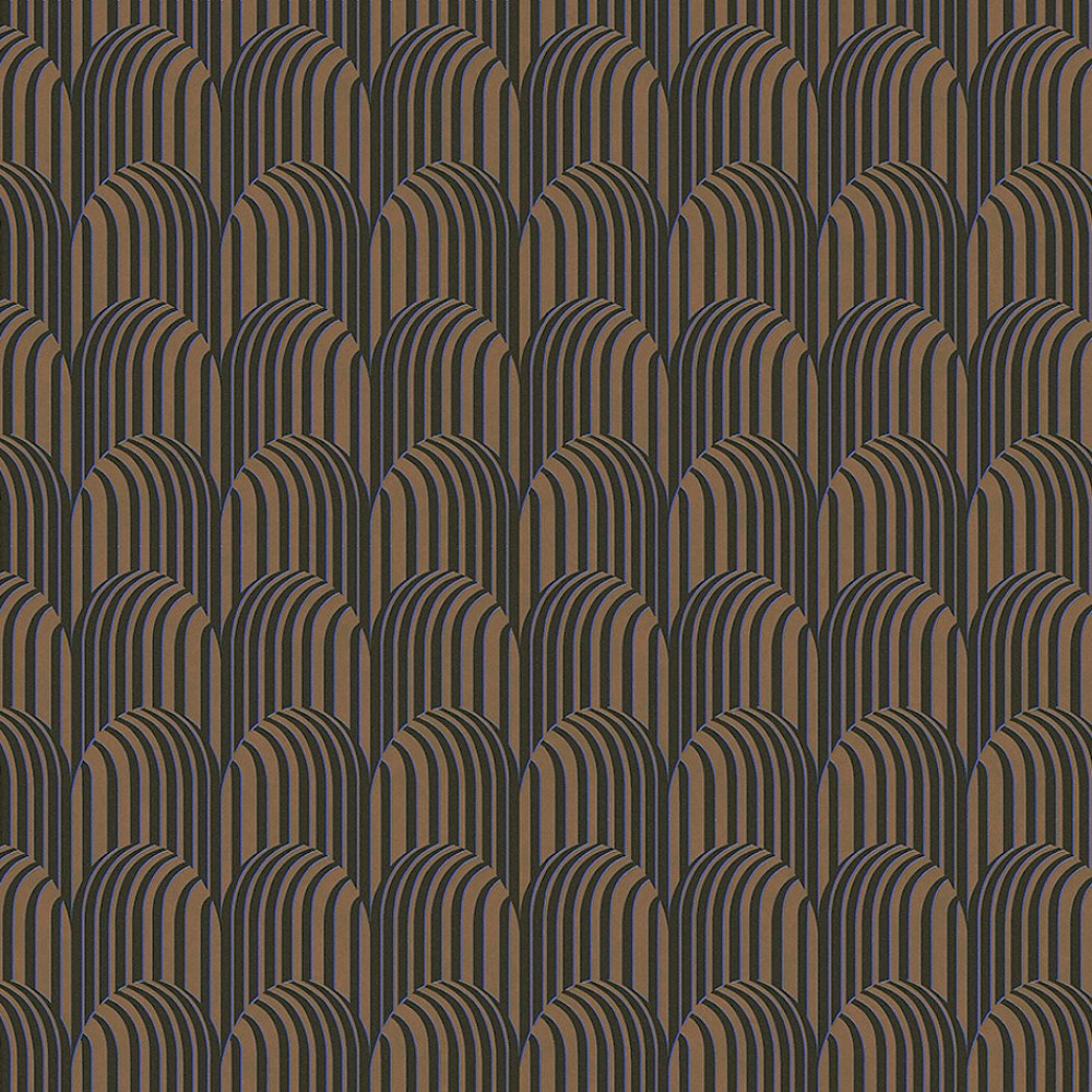 Tento krásný design travertinového stolu je převedený z 3D objektu do 2D výkresu. Optický klam je umocněn jemným stínováním v kontrastním lesku. Světlo osvětluje oblouky a dodává tapetě výrazně architektonický dojem.