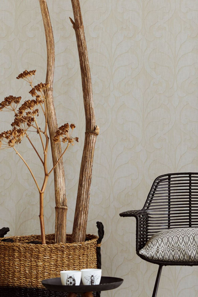 Úžasná šedobéžová tapeta z kolekce inspirované krásou Afriky. Tapeta je zdobená florálním oranamentem.
