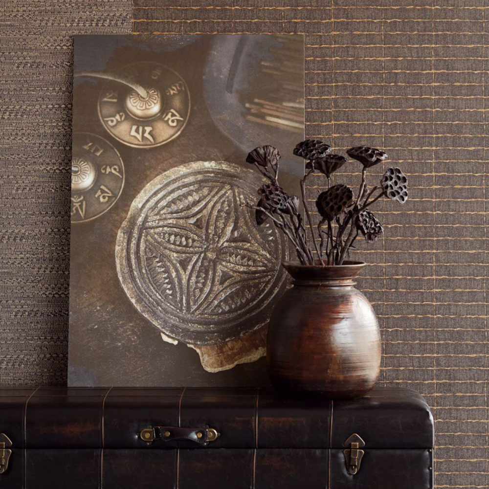 Nádherná tapeta z kolekce inspirované africkým duchem. Tato tapeta v černé barvě připomíná látku. Podklad tvoří černá barva promíchaná s tmavou hnědou. Celek je pak dotvořen zlatým zdobením.