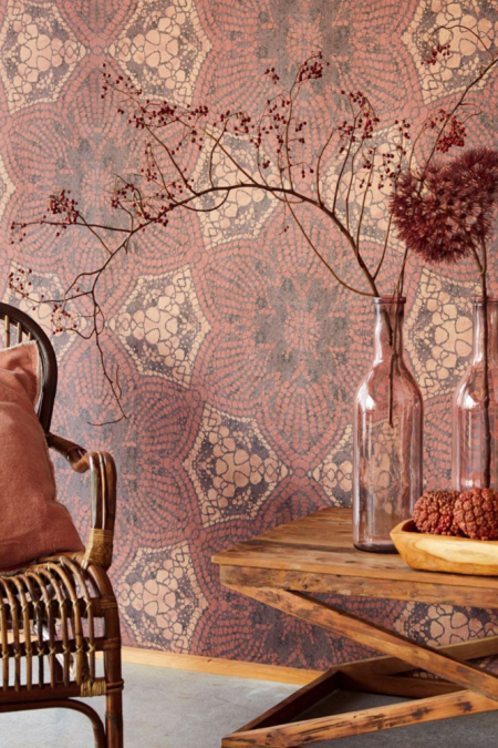 Úchvatná tapeta z kolekce inspirované krásou Afriky. Hlavním květinový motiv je v červené barvě, která je doplněna bronzem, černou a tmavě hnědou barvou.