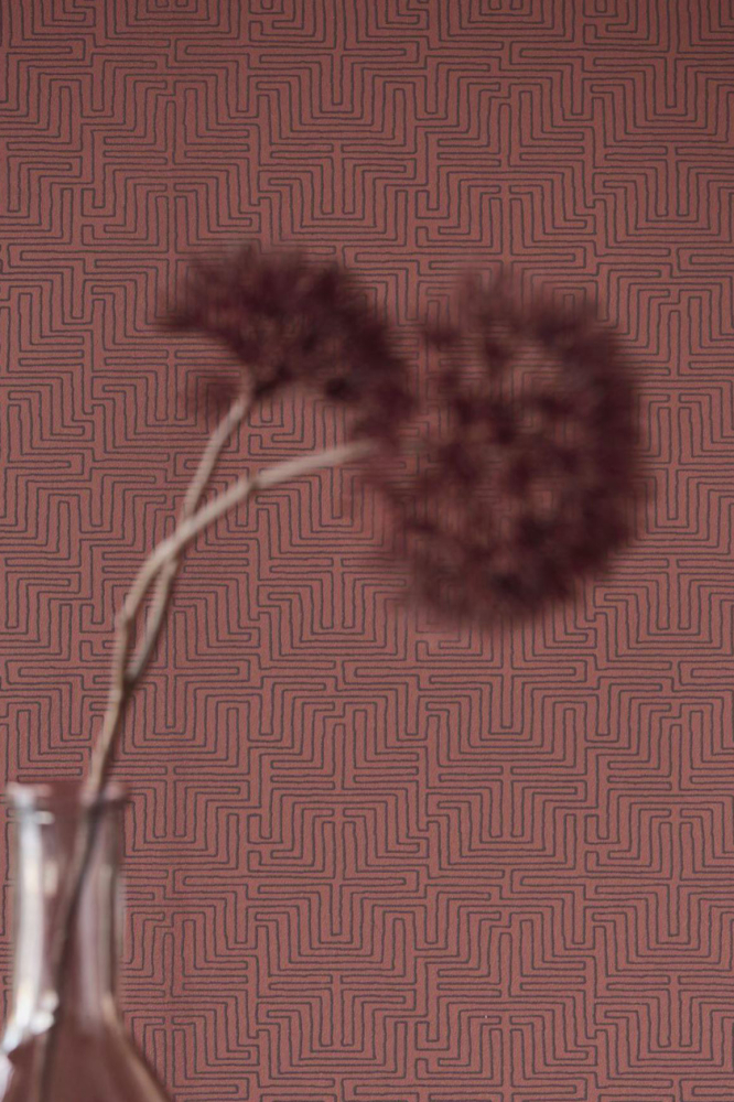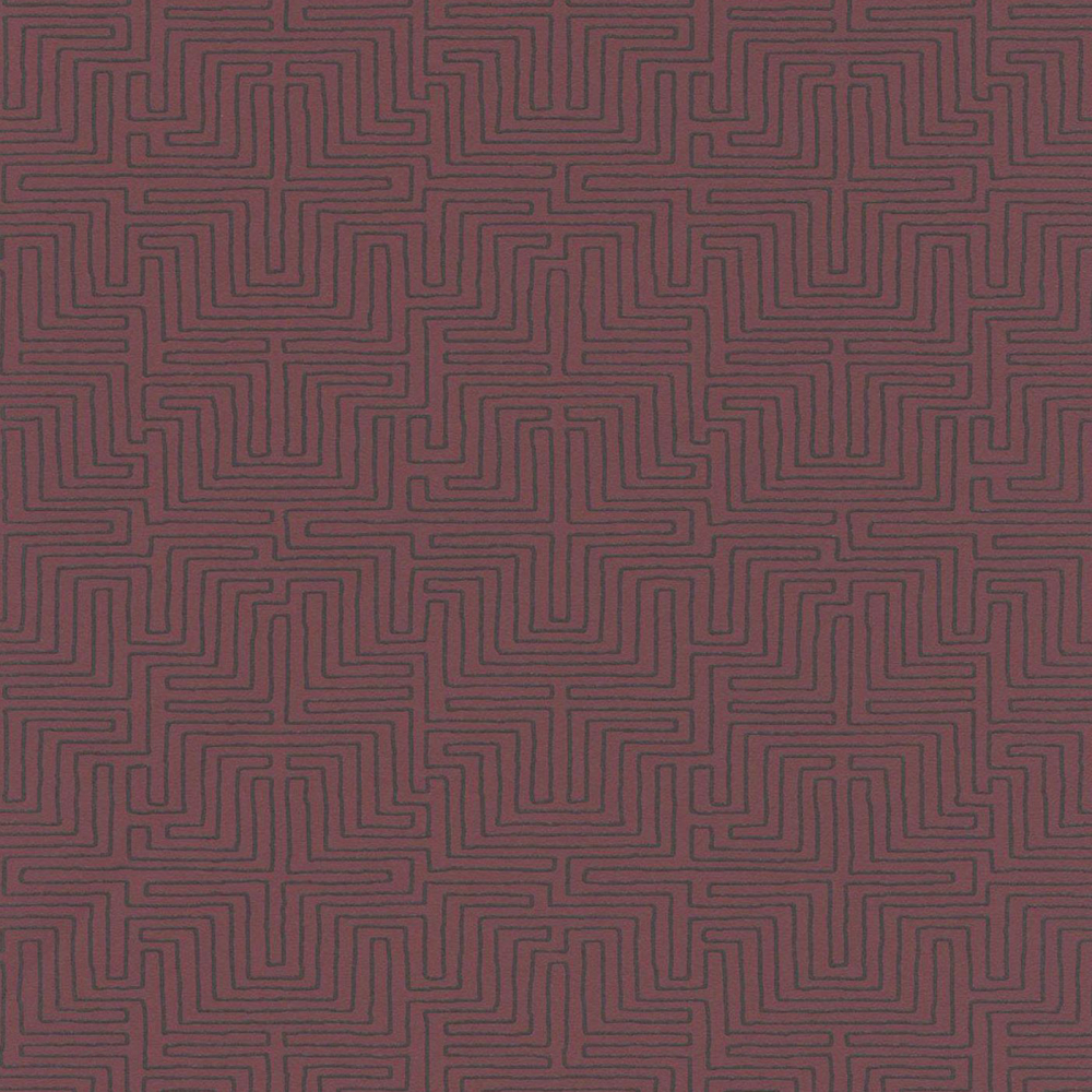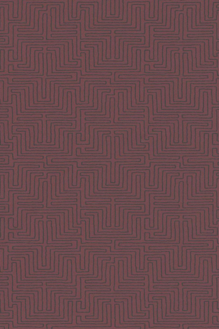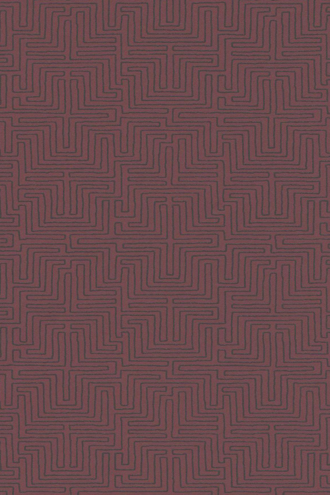 Elegantní bordó tapeta z kolekce inspirované afrikckým uměním. Tapeta je zdobená "bludištěm" v tmavě šedé barvě.