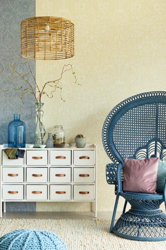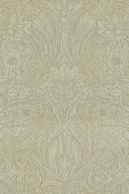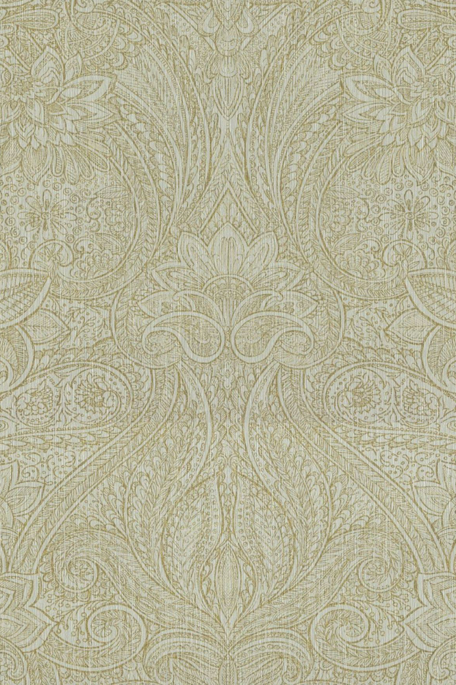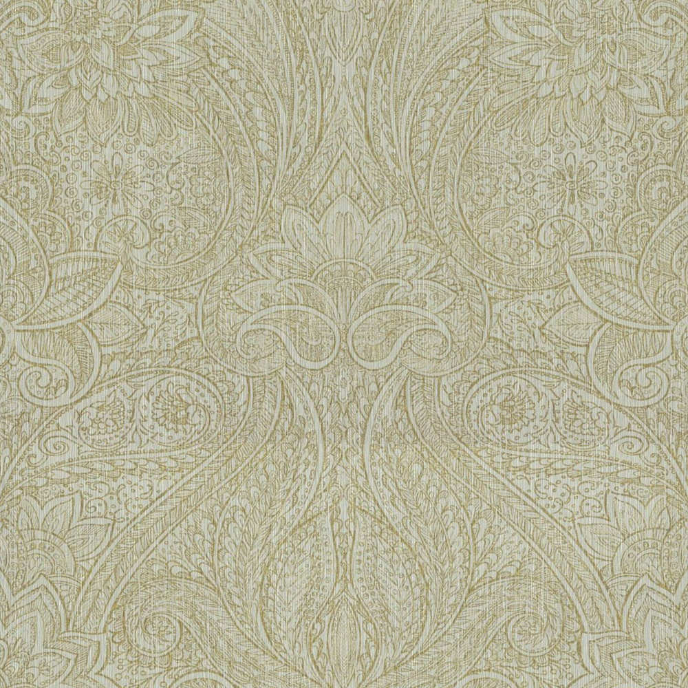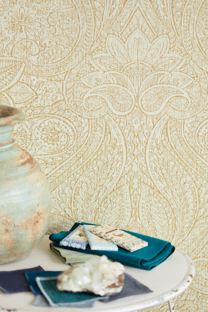 Krásná tapeta s etno nádechem. Béžová barva je nakombinována se zlatým florálním ornamentem.