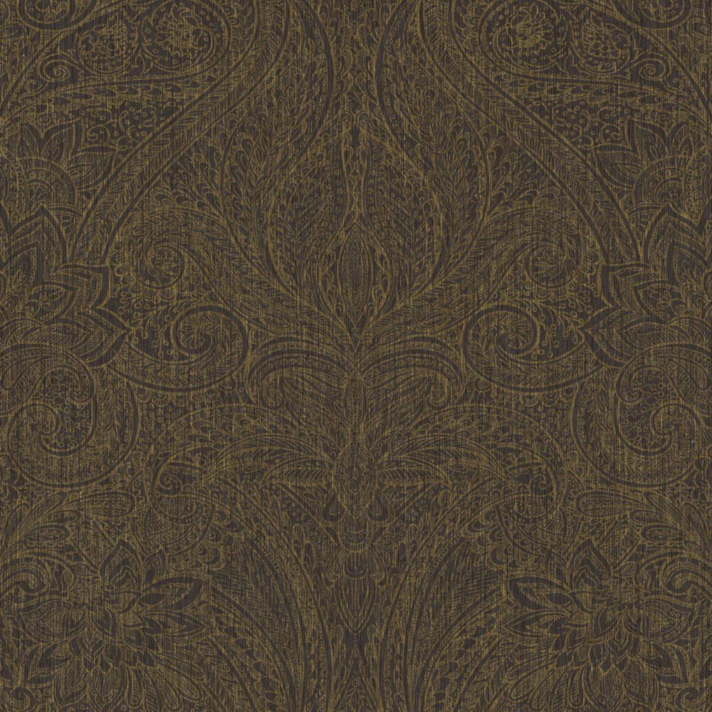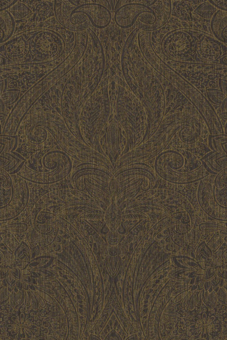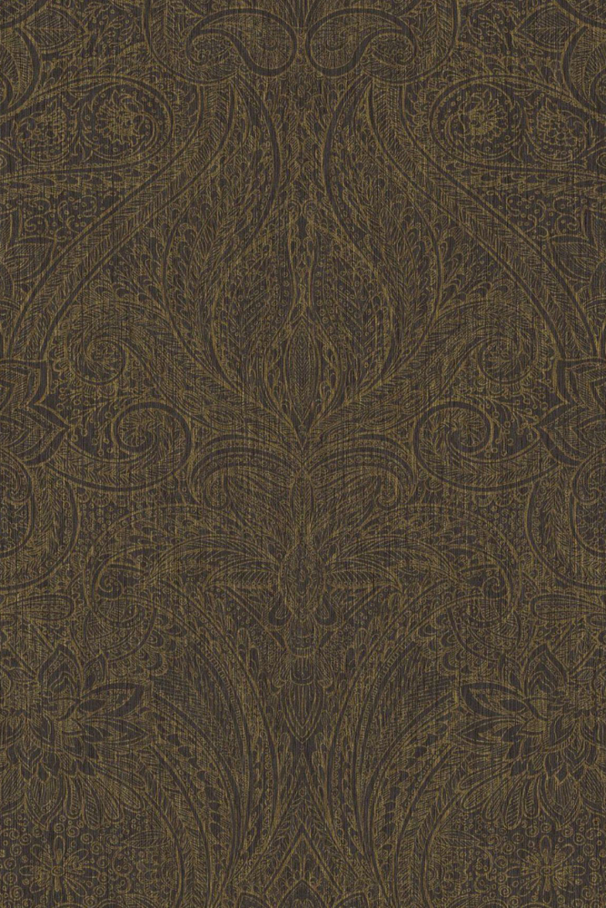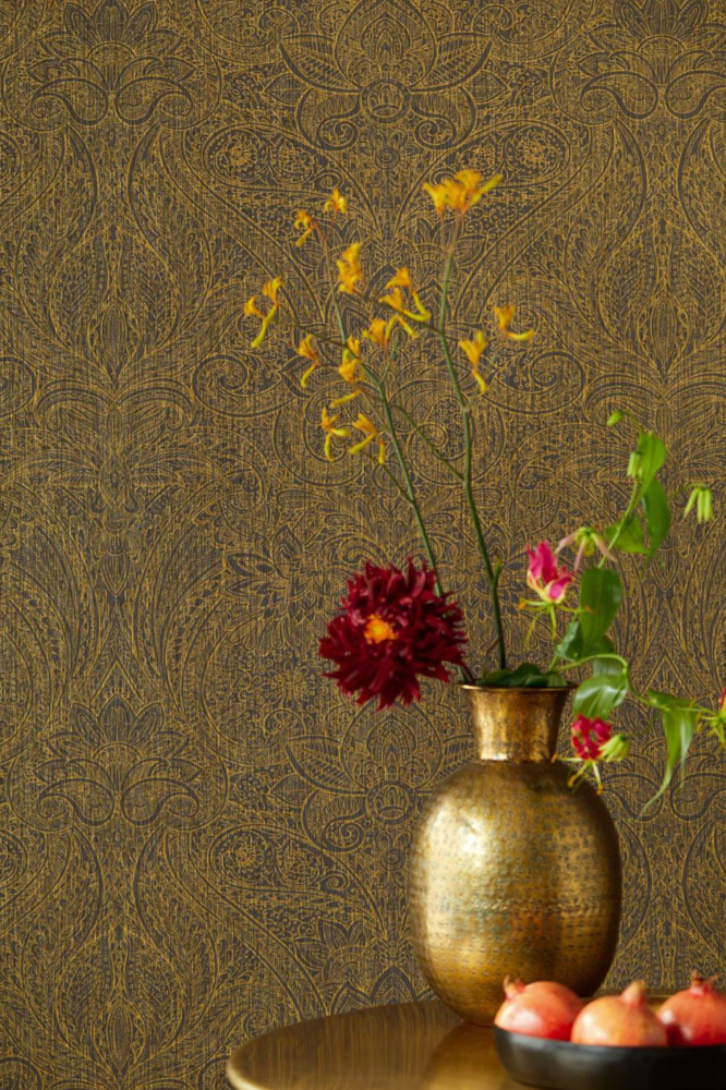 Krásná tapeta s etno nádechem. Černá barva je nakombinována se zlatým florálním ornamentem.